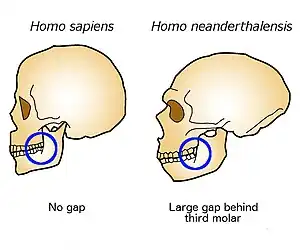 This gap is generally small or absent in modern humans, but it was more often present in Neanderthals,[1] and it was common among some prehistoric Amerindians, such as Arikara and Mandan.[2][3]