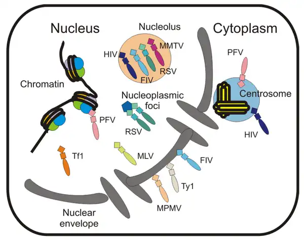 - ↑ Stake, Matthew S.; Bann, Darrin V.; Kaddis, Rebecca J.; Parent, Leslie J. (18 November 2013). "Nuclear trafficking of retroviral RNAs and Gag proteins during late steps of replication". Viruses. 5 (11): 2767–2795. doi:10.3390/v5112767. ISSN 1999-4915. PMC 3856414. PMID 24253283.