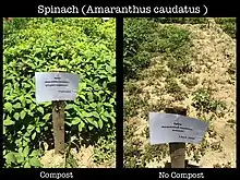 Comparison of spinach field with (left) and without (right) compost, experiments at the SOIL farm in Port-au-Prince, Haiti