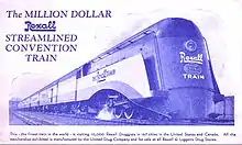 The Rexall Train of March to November 1936 toured the United States and Canada to promote Rexall drug store products and to provide the equivalent of a national convention for local Rexall druggists without the cost of travel. Free tickets for locals to see displays of Rexall products were available at local Rexall drug stores. The 29,000 mile tour visited 47 of the 48 contiguous states (omitting Nevada) and parts of Canada.