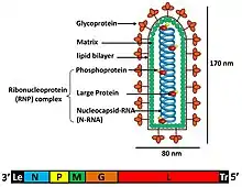 The virions are about 75 nm wide and 180 nm long.[2] Rhabdoviruses are enveloped and have helical nucleocapsids and their genomes are linear, around 11–15 kb in length.[5][2] Rhabdoviruses carry their genetic material in the form of negative-sense single-stranded RNA. They typically carry genes for five proteins: large protein (L), glycoprotein (G), nucleoprotein (N), phosphoprotein (P), and matrix protein (M).[13] The sequence of these protein genes from the 3 'end to the 5' end in the genome is N–P–M–G–L.[14] Every rhabdoviruses encode these five proteins in their genomes. In addition to these proteins, many rhabdoviruses encode one or more proteins.[15] The first four genes encode major structural proteins that participate in the structure of the virion envelope.[14]