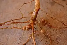 Rhizobia are a "group of soil bacteria that infect the roots of legumes to form root nodules".[2] Rhizobia are found in the soil and, after infection, produce nodules in the legume where they fix nitrogen gas (N2) from the atmosphere, turning it into a more readily useful form of nitrogen. From here, the nitrogen is exported from the nodules and used for growth in the legume. Once the legume dies, the nodule breaks down and releases the rhizobia back into the soil, where they can live individually or reinfect a new legume host.[2]