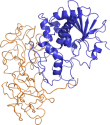 Ricin structure (PDB: 2AAI). The A chain is shown in blue and the B chain in orange.