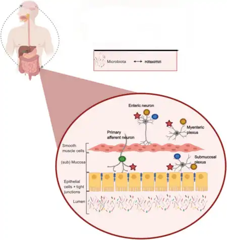 Other mechanisms for its therapeutic properties include inhibition of bacterial translocation across the epithelial lining of the intestine, inhibition of adherence of bacteria to the epithelial cells and a reduction in the expression of proinflammatory cytokines.[23]