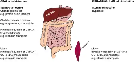 Mechanisms of drug–drug interaction after oral versus intramuscular administration of cabotegravir and rilpivirine[21]
