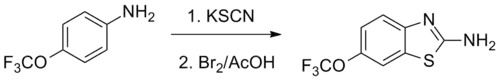 Riluzole can be prepared beginning with the reaction of 4-(trifluoromethoxy)aniline with potassium thiocyanate followed by reaction with bromine, forming the thiazole ring.[20][21][22]