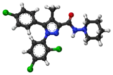 Rimonabant (also known as SR141716; trade names Acomplia, Zimulti)[3] is an anorectic antiobesity drug approved in Europe in 2006 but was withdrawn worldwide in 2008 due to serious psychiatric side effects; it was never approved in the United States.[1][2] Rimonabant is an inverse agonist for the cannabinoid receptor CB1 and was first-in-class for clinical development.[4][5]