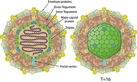 Viral replication is nuclear, and is lysogenic. Entry into the host cell is achieved by attachment of the viral glycoproteins to host receptors, which mediates endocytosis. Replication follows the dsDNA bidirectional replication model. DNA-templated transcription, with some alternative splicing mechanism, is the method of transcription. The virus exits the host cell by nuclear egress, and budding. Humans serve as the natural host. Transmission routes are direct contact and respiratory.[1]