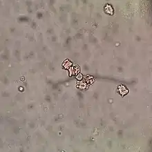 Rouleaux (singular is rouleau) are stacks or aggregations of red blood cells (RBCs) that form because of the unique discoid shape of the cells in vertebrates. The flat surface of the discoid RBCs gives them a large surface area to make contact with and stick to each other; thus forming a rouleau. They occur when the plasma protein concentration is high, and, because of them, the ESR (erythrocyte sedimentation rate) is also increased. This is a nonspecific indicator of the presence of disease.[1]
