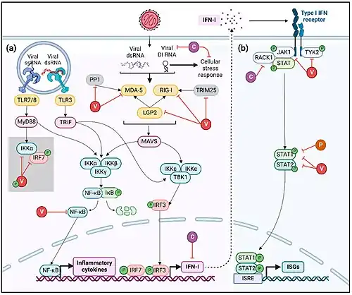 Mechanism of viral evasion;inhibition of IFN-I cascade -a) Viral RNA recognition by cellular PRR, activates multiple signaling cascades leads to IFN and NF-κB expression b) IFN-I-dependent signaling is inhibited by MeV[20]