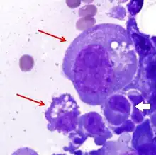 Mott cells with Russell bodies (red arrows), compared to an almost normal plasma cell (white arrow; it has a prominent nucleolus).