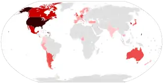 Epsilon (CAL.20C) was first observed in July 2020 by researchers at the Cedars-Sinai Medical Center, California, in one of 1,230 virus samples collected in Los Angeles County from the start of the COVID-19 epidemic.[1] It was not detected again until September when it reappeared among samples in California, but numbers remained very low until November.[8][9] In November 2020, the Epsilon variant accounted for 36 percent of samples collected at Cedars-Sinai Medical Center, and by January 2021, the Epsilon variant accounted for 50 percent of samples.[3] In a joint press release by University of California, San Francisco, California Department of Public Health, and Santa Clara County Public Health Department,[10] it was announced that the variant was also detected in multiple counties in Northern California. From November to December 2020, the frequency of the variant in sequenced cases from Northern California rose from 3% to 25%.[11] A preprint describes CAL.20C as belonging to Nextstrain clade 20C and contributing approximately 36% of samples, while an emerging variant from the 20G clade accounts for some 24% of the samples in a study focused on Southern California. However, in the US as a whole, the 20G clade predominated as of January 2021. Following the increasing numbers of Epsilon in California, the variant has been detected at varying frequencies in most US states. Small numbers have been detected in other countries in North America, and in Europe, Asia and Australia.[8][9] As of July 2021, the Epsilon variant had been detected in 45 countries, according to GISAID.[12] After an initial increase, its frequency rapidly decreased from February 2021 as it was being outcompeted by the more transmissible Alpha variant. In April, Epsilon remained relatively frequent in parts of northern California, but it had virtually disappeared from the south of the state and had never been able to establish itself elsewhere; only 3.2% of all cases in the United States were Epsilon, whereas by then more than two-thirds were Alpha.[13]