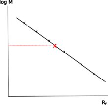 For a more accurate determination of the molecular weight, the relative migration distances of the individual protein bands are measured in the separating gel.[58][59] The measurements are usually performed in triplicate for increased accuracy. The relative mobility (called Rf value or Rm value) is the quotient of the distance of the band of the protein and the distance of the buffer front. The distances of the bands and the buffer front are each measured from the beginning of the separation gel. The distance of the buffer front roughly corresponds to the distance of the bromophenol blue contained in the sample buffer. The relative distances of the proteins of the size marker are plotted semi-logarithmically against their known molecular weights. By comparison with the linear part of the generated graph or by a regression analysis, the molecular weight of an unknown protein can be determined by its relative mobility.[58]
