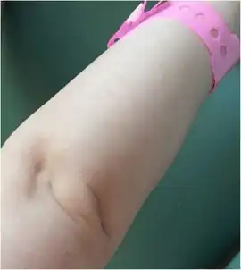 SHORT is an acronym for short stature, hyperextensibility of joints and/or inguinal hernia, ocular depression, Rieger anomaly and teething delay. Other characteristics common in SHORT syndrome are a triangular face, a prominent forehead, small chin with a dimple, a loss of fat under the skin (lipodystrophy), prominent ears (but no low implantation or posterior localisation), hearing loss and delayed speech. Facial lipodystrophy may be evident during birth and later on in the chest and higher extremities, but it usually won't affect buttocks and legs. Diabetes has been observed in ⅔ of the affected after they turn 15.