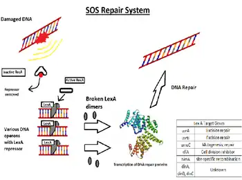- ↑ Michel B (July 2005). "After 30 years of study, the bacterial SOS response still surprises us". PLOS Biology. 3 (7): e255. doi:10.1371/journal.pbio.0030255. PMC 1174825. PMID 16000023.