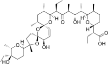 (2R)-2-[(5S,6R)-6-[(1S,2S,3S,5R)-5-[(2S,5R,7S,9S,10S,12R,15R)-2-[(2R,5R,6S)-5-ethyl-5-hydroxy-6-methyl-2-tetrahydropyranyl]-15-hydroxy-2,10,12-trimethyl-1,6,8-trioxadispiro[4.1.57.35]pentadec-13-en-9-yl]-2-hydroxy-1,3-dimethyl-4-oxoheptyl]-5-methyl-2-tetrahydropyranyl]butanoic acid | |