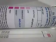 In 2009 Pink, et al., reported that saliva testing had become so widespread that it had begun to replace urine testing as the standard for detecting illicit drugs and prescription medications.[86] Shin, et al., reported in 2008 that salivary detection of ethanol and three of its metabolites (methanol, ethylene glycol, and diethylene glycol) had "relatively high sensitivity and specificity" and that such testing facilitates rapid diagnosis of alcohol intoxication.[87] A 2002 study demonstrated that there was good agreement between saliva and breath ethanol analysis, and that chromatographic saliva ethanol assay is "specific…[and] shows good accuracy and precision."[88] In 2011 Vindenes, et al., investigated the viability of drug abuse monitoring using saliva, comparing this method to urine drug detection. Researchers found that several drug metabolites were detected more frequently in saliva than in urine; this was true for 6-monoacetylmorphine, amphetamine, methamphetamine, and N-desmethyldiazepam.[89] This same study showed that saliva testing could detect other drug metabolites, as well, although not as frequently as urine testing; this was the case for morphine, other benzodiazepines, cannabis, and cocaine.[86]