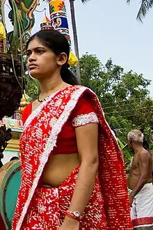 Sari tightened around the waist. A man wearing a dhoti is seen in the background. | |