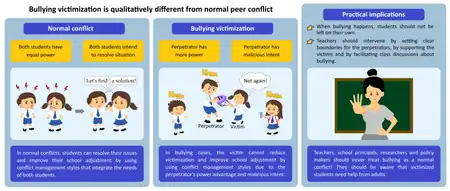 Bullying is a subcategory of aggressive behavior that is characterised by hostile intent (the harm caused is deliberate), imbalance of power (real or perceived power inequality between bully and victim), and repetition over a period of time.[19][20][21] More ordinary types of student-student conflicts, which are sometimes part of everyday school life, are not associated with an imbalance of power. In contrast to more ordinary conflicts, school bullying can severely harm victimized students.[22]
