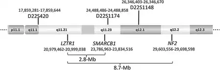 Diagream of chromosome 22 indicating the location of the LZTR1, SMARCB1, and NF2 genes.[1] In individuals with schwannomatosis, greater than fifty different mutations in the LZTR1 gene are observed.[2] | |