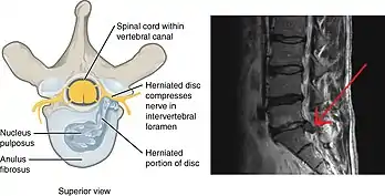 Left: Illustration of herniated spinal disc, superior view. Right: MRI showing herniated L5-S1 disc (red arrow tip), sagittal view.