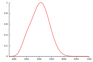 The maximum scotopic efficacy is 1700 lm/W at 507 nm (compared with 683 lm/W at 555 nm for maximum photopic efficacy).[9] While the ratio between scotopic and photopic efficacies is only around 2.5 counted at peak sensitivity the ratio increases strongly below 500 nm.