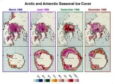 Since thickening of the sea ice during winter months results in more salts being expelled from the frazil ice, atmospheric temperatures are strongly and negatively correlated to brine salinity. The sea ice-seawater interface temperature is maintained at the freezing point of seawater (~1.8 °C) while the sea ice-air interface reflects more the current atmospheric temperature.[4] Brine salinity can increase to as much as 100 PSU when sea ice temperature reaches ~3 °C below the freezing point of seawater.[5] Brine temperature typically ranges from -1.9 to -6.7 °C in the winter.[6] Sea ice temperatures fluctuate in response to irradiance and atmospheric temperatures, but also change in response to the volume of snowfall. Accumulating snow on the ice cover combined with harsh atmospheric conditions can lead to the formation of a snowpack layer that absorbs UV radiations and provides insulation to the bottom ice layer. The fraction of irradiance reaching the sea ice matrix is thus also controlled by the amount of snowfall and varies from <0.01% to 5% depending on the thickness and density of the snowpack.[4]