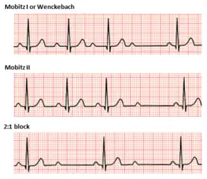 Second-degree atrioventricular block (second-degree AV block) is were the electrical signals from the upper to lower chambers of the heart are occasionally blocked.[1] It is divided into Mobitz type I and Mobitz type II.[2] Type I disease usually has no symptoms while type II disease often presents with tiredness, shortness of breath, chest pain, or syncope.[1] Type II disease may progress to third-degree AV block or sudden cardiac death.[1]
