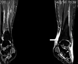 Image with extensive epifascial edema in left foot of individual with secondary lymphedema | |