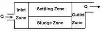 In the inlet zone, flow is established in a same forward direction. Sedimentation occurs in the settling zone as the water flow towards to outlet zone. The clarified liquid is then flow out from outlet zone. Sludge zone: settled will be collected here and usually we assume that it is removed from water flow once the particles arrives the sludge zone.[9]