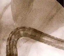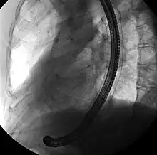 Fluoroscopic image of self-expandable metallic stent in the esophagus. The black solid structure is the endoscope used to place the stent.