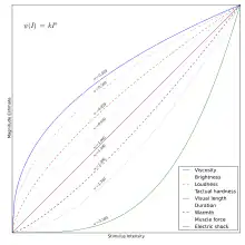 Magnitude estimation is a psychophysical method in which subjects assign perceived values of given stimuli. The relationship between stimulus intensity and perceptive intensity is described by Steven's power law.[6]