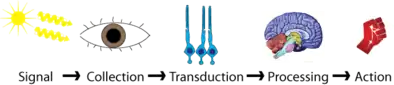 Sensory receptors are the cells or structures that detect sensations. Stimuli in the environment activate specialized receptor cells in the peripheral nervous system. During transduction, physical stimulus is converted into action potential by receptors and transmitted towards the central nervous system for processing.[17] Different types of stimuli are sensed by different types of receptor cells. Receptor cells can be classified into types on the basis of three different criteria: cell type, position, and function. Receptors can be classified structurally on the basis of cell type and their position in relation to stimuli they sense. Receptors can further be classified functionally on the basis of the transduction of stimuli, or how the mechanical stimulus, light, or chemical changed the cell membrane potential.[16]