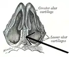 Cartilages of the nose, seen from below (cartilage of septum visible in blue at bottom center)