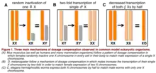 Different lineages have evolved different mechanisms to cope with the differences in gene copy numbers between the sexes that are observed on sex chromosomes. Some lineages have evolved dosage compensation, an epigenetic mechanism which restores expression of X or Z specific genes in the heterogametic sex to the same levels observed in the ancestor prior to the evolution of the sex chromosome.[2][3] Other lineages equalize the expression of the X- or Z- specific genes between the sexes, but not to the ancestral levels, i.e. they possess incomplete compensation with "dosage balance". One example of this is X-inactivation which occurs in humans. The third documented type of gene dose regulatory mechanism is incomplete compensation without balance (sometimes referred to as incomplete or partial dosage compensation). In this system gene expression of sex-specific loci is reduced in the heterogametic sex i.e. the females in ZZ/ZW systems and males in XX/XY systems.[4]