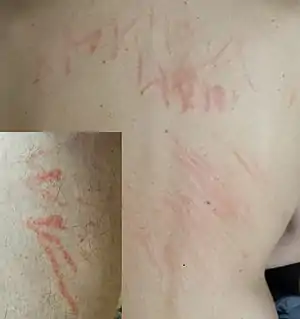 Symptoms on back and leg. Stripes appear when skin is scratched or spontaneously in friction or contact zones. | |