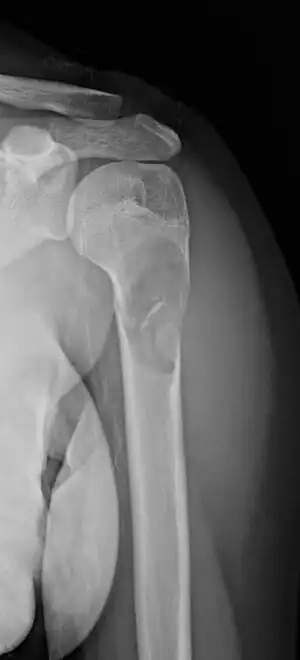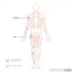 Most simple bone cysts do not cause any symptoms and are discovered as accidental findings on radiographs or CT scans made for other reasons.[3] Although it can form in any bone structure, it is predominantly found in the long bone of the upper arm near the shoulder, and long bone of the thigh near the hip.[6] Large lesions can cause nearby areas of bone to thin, which may result in a fracture and cause pain.[1][2] There may be a swelling or problem in moving the affected bone.[1]