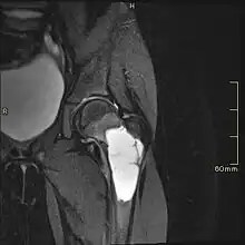 - Multloculated cavity in the long bone of the thigh, near the hip.