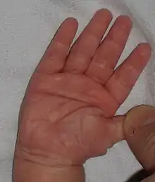 The presence of a single transverse palmar has been associated with a number of abnormal medical conditions — that is, it is found at a higher than 1.5% frequency, but in all of these conditions many do not have this crease. Examples of conditions with such an association are fetal alcohol syndrome, and with the genetic chromosomal abnormalities Down syndrome (chromosome 21), cri du chat syndrome (chromosome 5), Klinefelter syndrome, Wolf-Hirschhorn Syndrome, Noonan syndrome (chromosome 12), Patau syndrome (chromosome 13), IDIC 15/Dup15q (chromosome 15), Edward's syndrome (chromosome 18), and Aarskog-Scott syndrome (X-linked recessive), or autosomal recessive disorder, such as Leukocyte adhesion deficiency-2 (LAD2).[4] A unilateral single palmar crease was also reported in a case of chromosome 9 mutation causing Nevoid basal cell carcinoma syndrome and Robinow syndrome.[5] It is also sometimes found on the hand of the affected side of patients with Poland syndrome, and craniosynostosis.