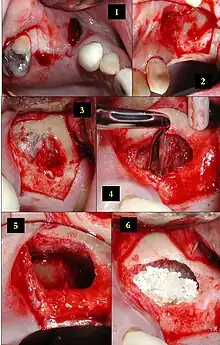 The graft material used can be either an autograft, an allograft, a xenograft, an alloplast (a growth-factor infused collagen matrix), synthetic variants, or combinations thereof.[7] Studies indicate that the mere lifting of the sinus membrane, creation of a void space and blood clot formation might result in new bone owing to the principles of guided bone regeneration.[8] The long-term prognosis for the technique is estimated to 94%.[9]