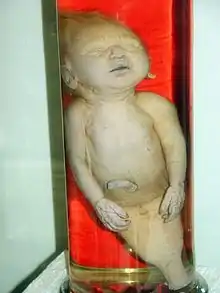 This condition is found in approximately one out of every 100,000 live births; studies produce rates from 1 in 68,741 to 1 in 97,807.[1][12] It is 100 to 150 times more likely in identical (monozygotic) twins than in singletons or fraternal twins.[11][1] Sirenomelia is not associated with any ethnic background, but fetuses with sirenomelia are more likely to be male.[1]