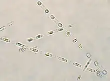 Skeletonema costatum is a cosmopolitan centric diatom that belongs to the genus Skeletonema.[1] It was first described by R. K. Greville, who originally named it Melosira costata, in 1866.[1] It was later renamed by Cleve in 1873 and was more narrowly defined by Zingone et al. and Sarno et al.[2][3][4][5] Skeletonema costatum is the most well known species of the genus Skeletonema and is often one of the dominant species responsible for red tide events.[4][6][7]
