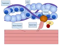 The first muscle protein discovered was myosin by a German scientist Willy Kühne, who extracted and named it in 1864.[7] In 1939 a Russian husband and wife team Vladimir Alexandrovich Engelhardt and Militsa Nikolaevna Lyubimova discovered that myosin had an enzymatic (called ATPase) property that can breakdown ATP to release energy.[8] Albert Szent-Györgyi, a Hungarian physiologist, turned his focus on muscle physiology after winning the Nobel Prize in Physiology or Medicine in 1937 for his works on vitamin C and fumaric acid. He demonstrated in 1942 that ATP was the source of energy for muscle contraction. He actually observed that muscle fibres containing myosin B shortened in the presence of ATP, but not with myosin A, the experience which he later described as "perhaps the most thrilling moment of my life."[9] With Brunó Ferenc Straub, he soon found that myosin B was associated with another protein, which they called actin, while myosin A was not. Straub purified actin in 1942, and Szent-Györgyi purified myosin A in 1943. It became apparent that myosin B was a combination of myosin A and actin, so that myosin A retained the original name, whereas they renamed myosin B as actomyosin. By the end of the 1940s Szent-Györgyi's team had postulated with evidence that contraction of actomyosin was equivalent to muscle contraction as a whole.[10] But the notion was generally opposed, even from the likes of Nobel laureates such as Otto Fritz Meyerhof and Archibald Hill, who adhered to the prevailing dogma that myosin was a structural protein and not a functional enzyme.[3] However, in one of his last contributions to muscle research, Szent-Györgyi demonstrated that actomyosin driven by ATP was the basic principle of muscle contraction.[11]