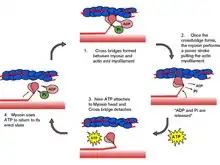 With substantial evidence, Hugh Huxley formally proposed the mechanism for sliding filament which is variously called swinging cross-bridge model, cross-bridge theory or cross-bridge model.[3][30] (He himself preferred the name "swinging crossbridge model", because, as he recalled, "it [the discovery] was, after all, the 1960s".[2]) He published his theory in the 20 June 1969 issue of Science under the title "The Mechanism of Muscular Contraction".[31] According to his theory, filament sliding occurs by cyclic attachment and detachment of myosin on actin filaments. Contraction occurs when the myosin pulls the actin filament towards the centre of the A band, detaches from actin and creates a force (stroke) to bind to the next actin molecule.[32] This idea was subsequently proven in detail, and is more appropriately known as the cross-bridge cycle.[33]