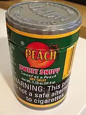 Snuff is a type of smokeless tobacco product made from finely ground or pulverized tobacco leaves.[1] It is snorted or "sniffed" (alternatively sometimes written as "snuffed") into the nasal cavity, delivering nicotine and a flavored scent to the user (especially if flavoring has been blended with the tobacco).[1] Traditionally, it is sniffed or inhaled lightly after a pinch of snuff is either placed onto the back surface of the hand, held pinched between thumb and index finger, or held by a specially made "snuffing" device.