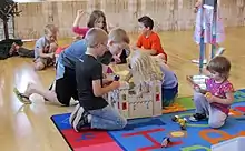 Play is often cited as a central building block to children's development, so much so that the United Nations Commission on Human Rights has declared it to be a human right of all children.[19] The complexity and diversity of play increases immensely in the preschool years, most notably with the onset of cooperative play, where children work toward a common goal, and socio-dramatic play (a type of cooperative play), where children act out make believe scenes.[7] Socio-dramatic play is rooted in the child's real-life experiences, falling into three categories: family scenes (e.g., "playing house" with assigned mommy and daddy roles), character scenes (e.g., being a superhero, or a princess), and functional scenes (e.g., playing doctor).[20] Cooperative play and socio-dramatic play both bring about increased social interactions, as compared to solitary play and parallel play, where children play similarly next to each other without significant interaction (e.g., two children building their own towers). It is here where play becomes intertwined with social emotional development. The characteristics of socio-dramatic play allow children to practice cooperation, negotiation, and conflict resolution skills, as well as engage in role-playing that promotes perspective taking. As such, socio-dramatic play has been associated with all of these social emotional skills in children.[20]