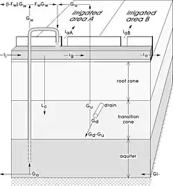 Aquifer conditions in irrigated land and the groundwater flow have an important role in soil salinization,[3] as illustrated here: