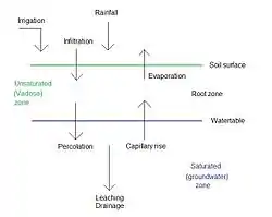 The vadose zone of the soil below the soil surface and the water table is subject to four main hydrological inflow and outflow factors:[3]