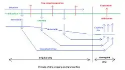 In irrigated lands with scarce water resources suffering from drainage (high water table) and soil salinity problems, strip cropping is sometimes practiced with strips of land where every other strip is irrigated while the strips in between are left permanently fallow.[16]