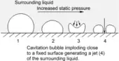 The mechanism of action for sonodynamic therapy is the use of low-intensity ultrasound through the use of focused mechanical waves to create a cytotoxic effect. However, SDT itself is non-thermal, non-toxic, and is able to non-invasively penetrate deep into tissue compared to other delivery methods such as photodynamic therapy. SDT is often performed alongside the use of a sonosensitizer such as porphyrin, phthalocyanines, xanthenes, and antitumor drugs.[17] Ultrasound waves are also classified as acoustic waves, and the effect they have on the tissue of application can be described by a process called cavitation. Cavitation occurs as a specific interaction between ultrasound and aqueous surroundings and causes gas bubbles to break upon exposure to particular ultrasonic parameters, thus promoting penetration of the therapeutic into the biological tissues by generating cavities near the edge of the membrane.[18][1] Cavitation can be broken down into stable and inertial cavitation. In stable cavitation, the oscillation of gas bubbles causes the environmental media to intermix.[1] In inertial cavitation, gas bubbles increase in volume and almost reach their resonance volume, swelling before aggressively collapsing.[1] The implosion of vesicles results in a drastic temperature and pressure change, thereby increasing the cell membrane's permeability to various drugs.[1][19] Microbubbles are created by the acoustic waves from the ultrasound that expand and collapse, releasing energy, bringing the sonosensitizer into an excited state, and generating a ROS. The cavitation of this gas bubble can form the ROS with different methodologies such as sonoluminescence and pyrolysis.[1] Apoptosis results from the formation of ROS and mechanical forces of SDT through membrane disruption in a process called lipid peroxidation. Necrosis is also a potential result of SDT.